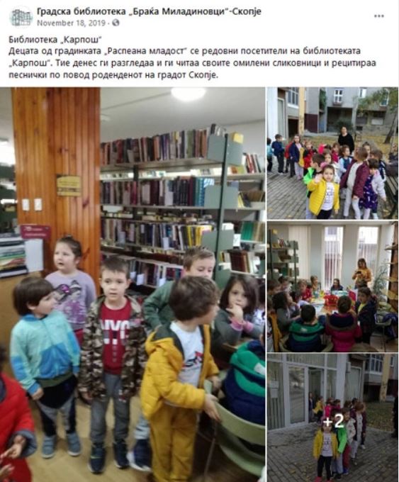 Како работат денес библиотеките во Македонија, во време на доминација на дигиталните медиуми, кога информацијата е достапна со еден допир на екранот на мобилниот телефон? Дали уредите можат да го заменат мирисот на книгата, што друго се случува во овие институции освен класичното позајмување книги? Библиотеката „Карпош“ покрива дел од истоимената скопска населба. Таа е клон на библиотеката „Другарче“ која е една од единиците на Градската библиотека „Браќа Миладиновци“ – Скопје. Има 370 члена, од кои околу 200 се активни. Вработените велат дека малите клон библиотеки создаваат неверојатна поврзаност со читателите.