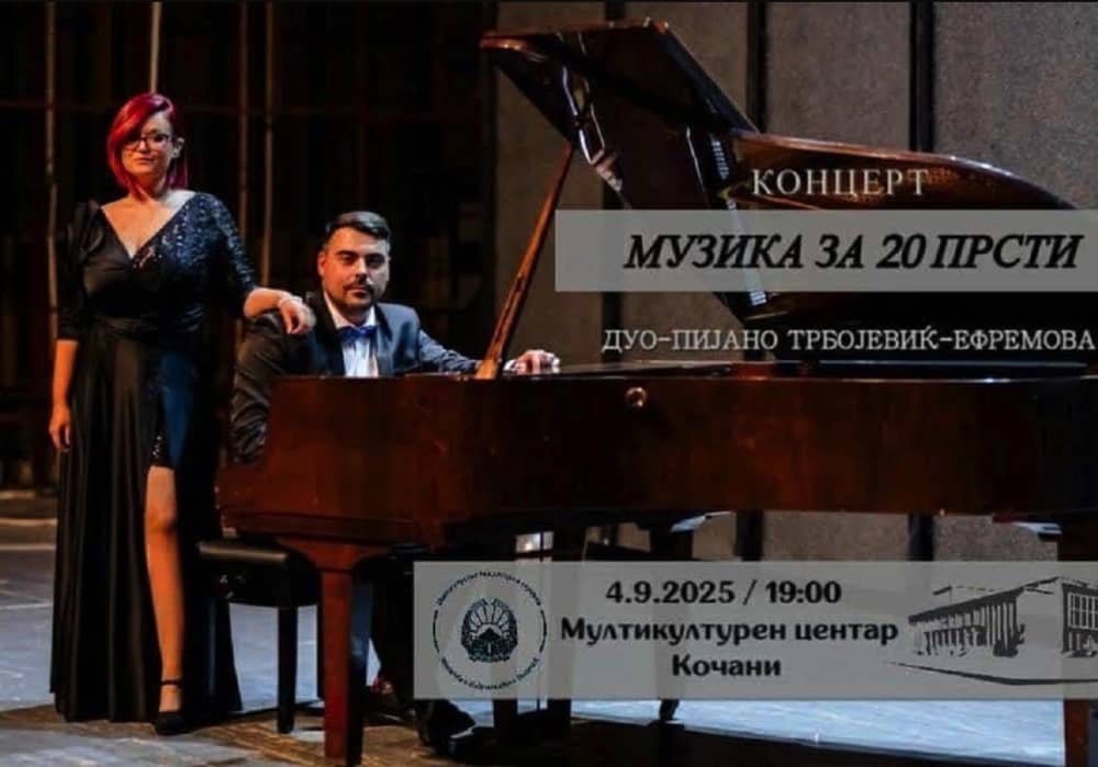 Во Мултикултурниот центар во Кочани вечерва во 19 часот ќе се одржи концерт за пијано, насловен „Музика за 20 прсти“. По 11 месеци, ова е прв музички настан во организација на Центарот за култура „Бели мугри“ во Кочани. Ќе настапат пијанистите Елена Ефремова и Петар Трбојевиќ од Штип.