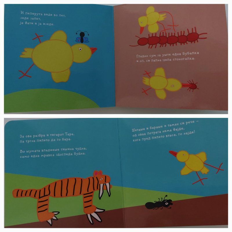 – Ликовите имаа силна експресија, цртежите континуитет и тоа беше мотив од нив да се направи приказна, па така се роди и текстот. Во книгата се зборува за едно пиле кое залутало во шумата. Бидејќи е гладно, почнува да јаде бубачки. Веста во шумата брзо се шири и бубачките една по една почнуваат да се кријат. Приказната има интересен ритам, а читателот останува љубопитен сè до самиот крај кога се дознава како пилето се нашло во шумата. И тоа дека стануваше збор за цртежи на тогаш шестгодишно дете, а мој син, ми даде дополнителен поттик – вели Трајчева-Иванова.