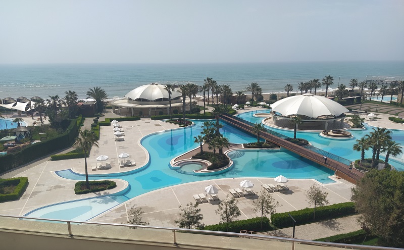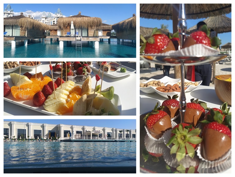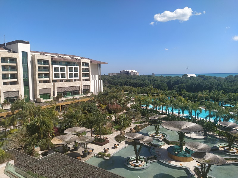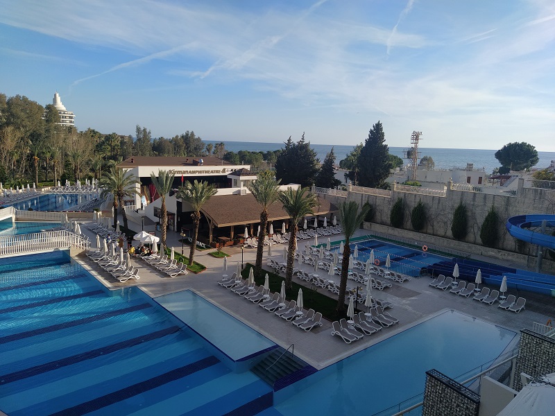 – Хотелот е поделен на две целини – едната е за семејства со деца, другата за гости без деца. Има девет ресторани, сè е бесплатно само треба еден ден однапред да се резервира. Внатрешниот базен е загреан, има спа, сауна, амам, мал трговски центар, фитнес клуб. Во текот на целиот ден има пица сервис, вафли, сладолед, овошје, сокови. На плажата има газебо што се плаќа дополнително – 100 евра од ден. Имаме терени за тенис и одлична песочна плажа – објаснува вработена во хотелот.