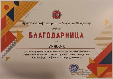 Умно.мк зедно со дваесеттина институции, комании и индивидуалци доби благодарница од Друштвото на физичарите на Република Македонија за поддршка на нивната работа со талентираните ученици и го помагаат учеството на олимпијадите. Во просториите на Природно-математичкиот факултет во Скопје, вчера Друштвото ја одржа традиционалната предновогодишна свеченост, на која пред присутните ученици, студенти, претставници на факултетот, гости, преставници на општествено одговорните компании и државните институциите кои ја поддржуваат работата со талентираните ученици од Македонија.