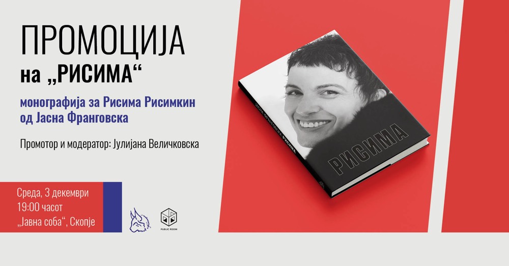 Во „Јавна соба“ во Скопје, на 3 декември (во 19 часот) ќе се одржи промоција на монографијата „Рисима“ од Јасна …