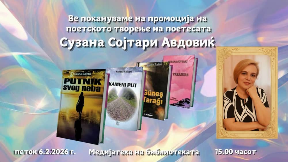 Поетското творештво на поетесата Сузана Сојтари Авдовиќ ќе биде промовирно денеска во 15 часот во Медијатеката на библиотеката „Гоце Делчев“ …