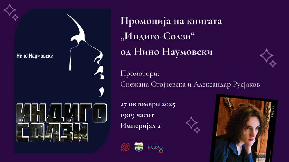 Книгата „Индиго солзи“ од Нино Наумовски во издание на „Бата прес“ ќе биде промовирана вечерва во 19.19 часот во Салон …
