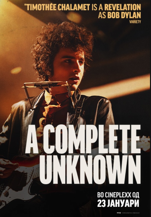 Впечатливата вистинита приказна за подемот на еден од најпрепознатливите кантавтори во историјата, Боб Дилан, „Целосно непознат“ од денеска се прикажува низ киносалите во Македонија. Со проекција од 17.45 часот во киното „Синеплекс“ од денеска на репертоарот во ова кино е светскиот хит посветен на легендарниот музичар Боб Дилан, како и во киносалите на „Киноверзум“ во Свети Николе, Велес, Кисела Вода и Штип. Филмот од денес се прикажува и во 3Д киното во Битола.