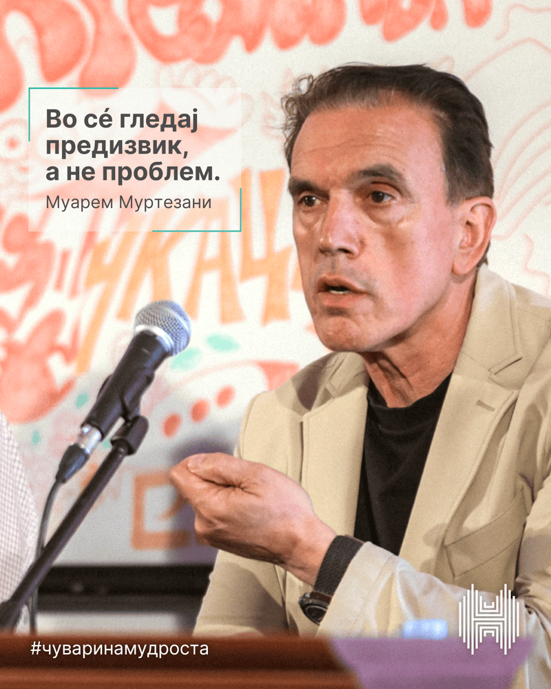 – Алгоритамот мора да ви е подесен да размислувате позитивно. За мене нема проблем, има предизвик. Види, па одлучи, водете се по тоа. Се запишав во „Панче Арсовски“, татко ми имаше мисија да се вработам во Железара. Ме запишаа со две јагниња. Секој родител сака дете да му оди на школо, јас се откажав. Работев како овчар, возев трактор, камион. Кога потпишав договор со Wrigle знаев дека ништо не знам. Најголема мудрот е да знаеме дека ништо не знаеме. Во школо се учи како да се плива и кога сте биле во река, во базен, треба да се плива. Треба акција, дејство. Стив Џобс ми е омилен лик од чии книги сум учел. Не мора да значи ако татко ви е директор, дека и вие мора да бидете, или дека ако е лекар и вие морате. Бидете тоа што сакате искрено. Важно е да се читаат книги. Јас прочитав 150 книги од кои 50 од нив и по неколку пати. Јас денес велам дека лани сум бил глуп, а наредна година сакам да бидам помалку глуп. Важно е да и да имате авторитет со луѓето со кои работите. Се учи од грешките. Одете на пракса, тропајте на врата самите. Сакам да видам повеќе претприемачи во Македонија. Сакам да видам дека овде се трошат парите што ги заработуваме, а не на кафе во Грција. Осмелете се, отворајте ваши мали бизниси. И многу важно, не се опкружувајте со негативни луѓе – рече Муртезани.