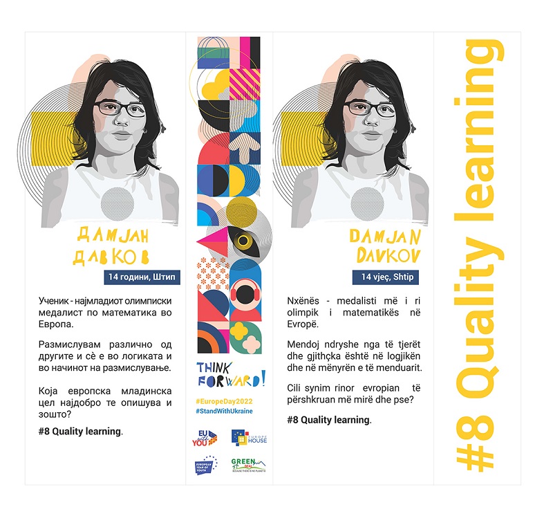 Тој беше еден од 12-те млади вклучени во изложбата Future of Europe, што Europe House Скопје ја организира во East Gate Mall. Секој учесник избира по една или две европски младински цели, според кои се води во своите постапки и во остварувањето на своите цели. Дамјан го избра квалитетното образование, зашто како што вели „тоа е многу важно“.