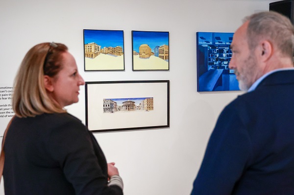 Ѕвездан Георгиевски, Јосип Коцев, Симона Јованоска, Радмила Живановиќ, Дијана Томик-Радевска и уметници што учествуваат на изложбата во резиденцијата на ЕУ.
