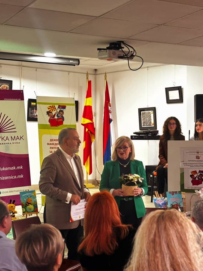 Во македонскиот Културно-информативен центар во Белград, пред бројни гости, меѓу кои и најмлади претставници на македонската заедница од Јабука, Србија, синоќа започна манифестацијата „Денови на македонската литература за деца 2025″. Книгоиздателството „Едука“ претстави шест нови книги и сликовници за деца, а беше врачена и наградата „Литературни пишувалки – прашувалки“, која годинава за сликовницата „Пчеличката Баз”, ја доби авторката Билјана Лотеска.