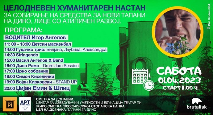 – Тоа не му пречи да растура на тапани! Но, му требаат нови, зашто старите му се уништени од „лупање“. Бидејќи Дино не може да си ги овозможи, решивме на 1 април да направиме хуманитарен настан и како од шега да собереме пари и да му ги купиме новите тапани – велат организиторите, „Театар Пи“, во соработка со „Арт бригада“ и „Бруталиск“.