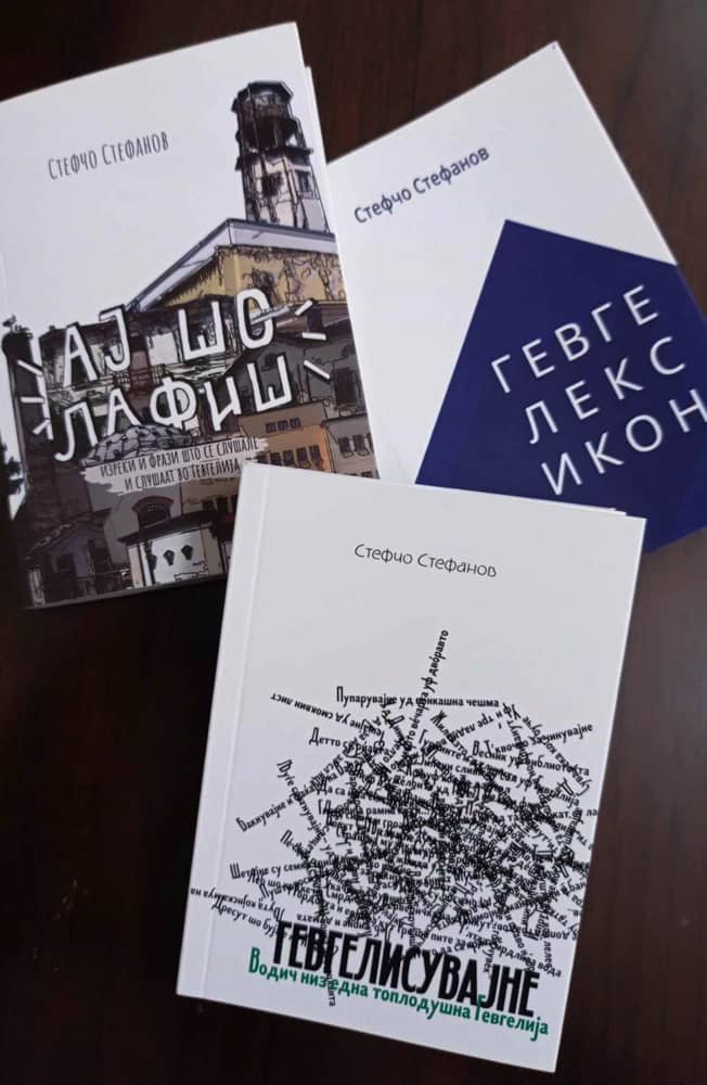 Значи, накратко за првите две. Првата моја книга на дијалект е „Гевгелексикон“ (2014) – книга со над илјада зборови од гевгелискиот дијалект и толкување за секој од нив на еден духовит начин, но суштински за она што дијалектот е. Таа книга еве и десет години по нејзиното објавување нескромно можам да речам дека е најбараната книга од роднокрајното издаваштво на градот Гевгелија, а за тоа зборува и планираниот нејзин шести тираж наскоро оваа есен. Понесен од таквата реакција на читателите, но и од еланот што не ми недостига кога треба да се биде креативно-храбар, дојде и идејата за втората книга на дијалект „Ај шо лафиш“ (2020). Тоа е книга со гевгелиски фрази и изреки и таа само ја надополни претходната успешна приказна. Мислев доста ќе е. Но ете, веднаш дојде и идејата таквата приказна да се заокружи во трилогија и се роди „Гевгелисувајне“ – Водич низ една топлодушна Гевгелија (2024) во издание на библиотека „Гоце Делчев“ – Гевгелија.