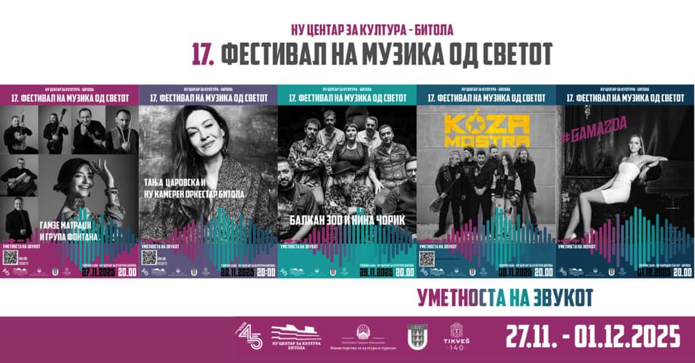 „Уметноста на звукот“ е мотото на 17. Фестивал на музика од светот, што ќе започне утревечер во 20 часот, со концерт групата „Фонтана“ од Битола и пејачката Гамзе Матраџи од Турција. „Фонтана“ 25 години остава печат на македонската и балканската сцена преку спој на традиционална музика со рок, метал, фанк и фјужн елементи. Гамзе Матраџи, пејачка родена во Измир со корени од Велес, позната по својот широк репертоар што ги спојува турската, македонската, ромската, албанската, босанската, грчката и српската традиција.