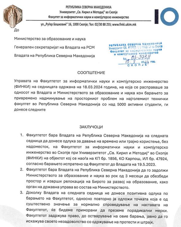 Протести и штрајк најави Факултетот за информатички науки и компјутерско инженерство (ФИНКИ), ако Владата не им обезбеди прстори за извршување на наставната дејност. Тие бараат Владата да го задолжи Министерството за образование и наука да го исели Бирото за развој на образованието (БРО) од објект во Техничко-технолошкиот кампус во скопската Општина Карпош и просториите да му ги предаде на трајно користење на ФИНКИ. Барањата ги потпиша деканот на факултетот, проф. д-р Боро Јакимовски, по вчерашната седница на факултетската Управа на која ФИНКИ го изрази своето незадоволство до Владата.
