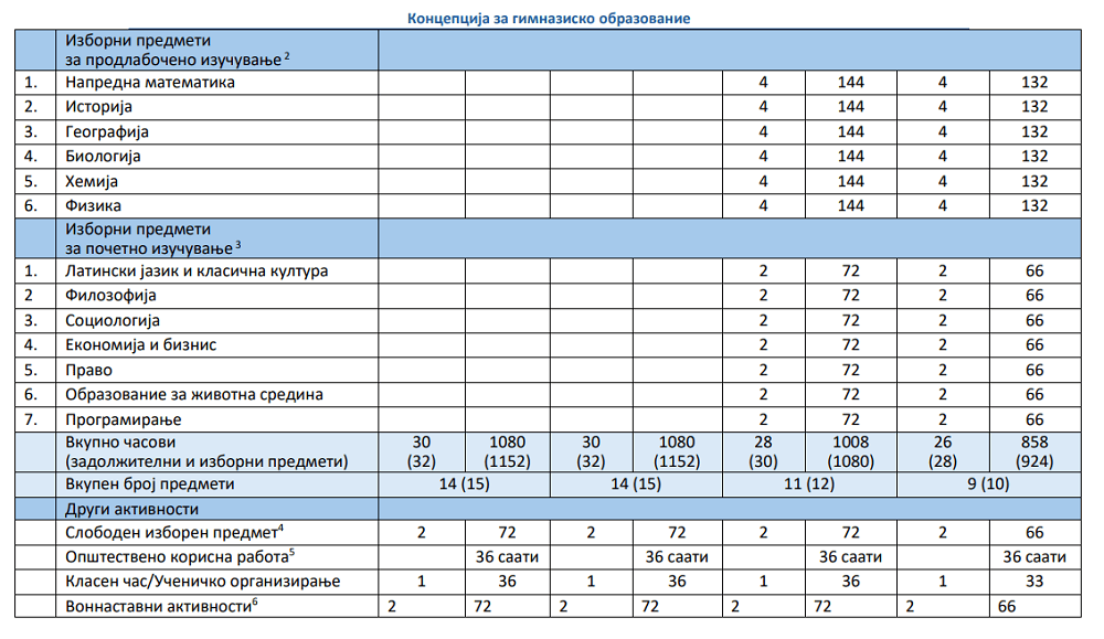 Според наставниот план за четиригодишно гимназиско образование образложен 43 страници, предлогот предвидува задолжителни предмети, изборни предмети за продлабочено учење, изборни предмети за почетно изучување и други активности.