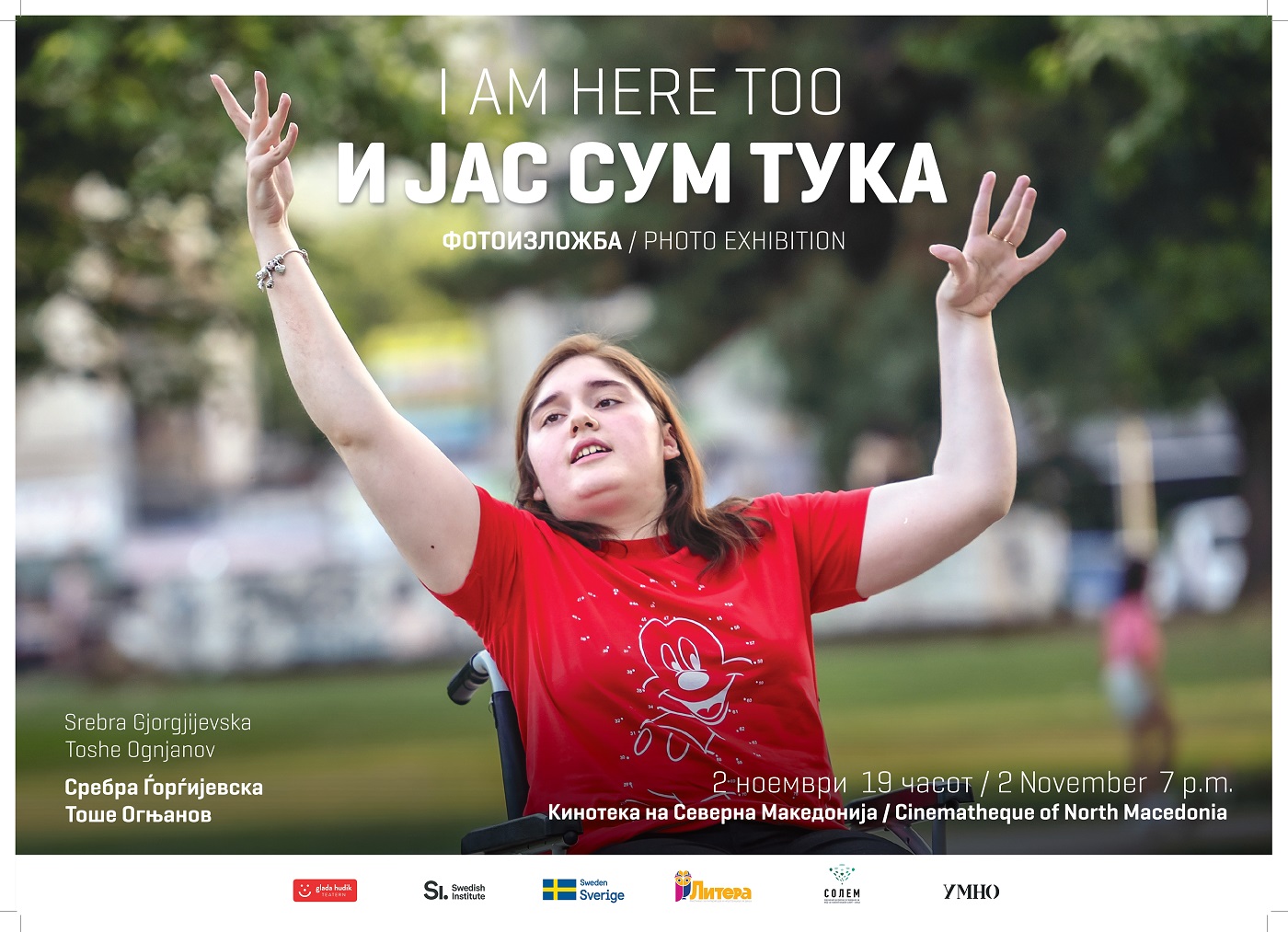 Изложба на фотопортрети „И јас сум тука“ на авторите Тоше Огњанов и Сребра Ѓорѓијевка ќе биде отворена утревечер во 19 часот во холот на Кинотеката. Во изложбата се вклучени 20 лица со посебни потреби од повеќе градови од Македонија на различна возраст, а портретите се придружени и од приказни посветени на нив.