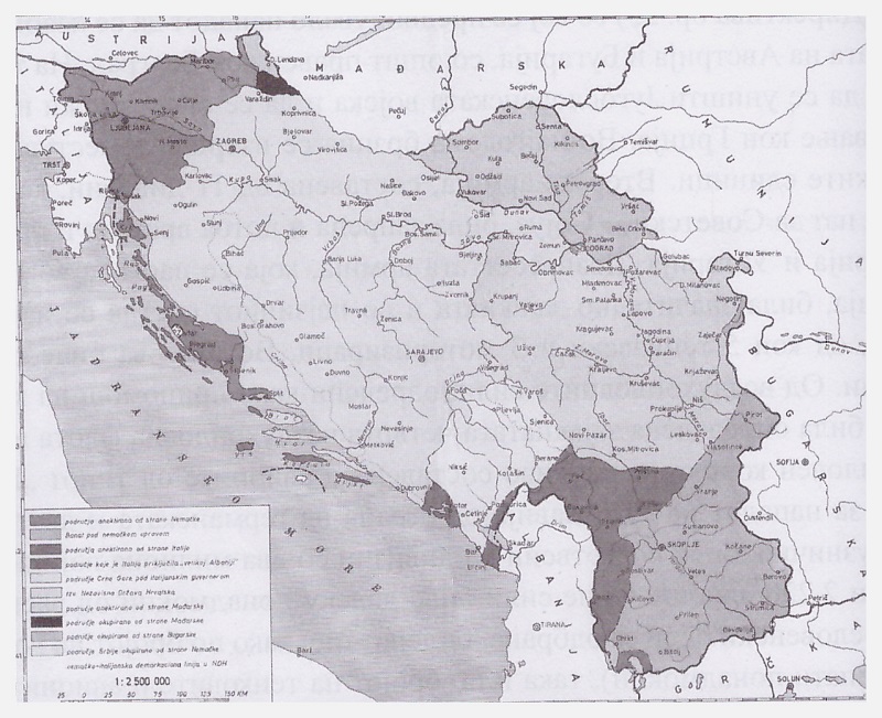 Да појасниме поконкретно за нашево поднебје. Во април 1941 година Кралството Југославија, а со тоа и денешната територија на Република Македонија, беше нападната од силите на Оската, предводени од нацистичка Германија. Тоа беше т.н. блицкриг војна која траеше само шест дена, по што Кралството Југославија капитулираше. Како награда за услугите што Бугарија ѝ ги направи на Хитлерова Германија, пуштајќи ги германските војски да ја искористат нејзината територија како база за напад на Југославија и Грција, ѝ беше дозволено да го присвои поголемиот дел од Македонија која дотогаш беше под власт на Кралството Југославија. Западниот дел на Македонија со градовите Тетово, Гостивар, Кичево, Дебар и Струга потпаднал под италијанска окупациона власт, која за кратко време со Декрет ѝ дозволила на нејзиниот сателит, Албанија да го анектира тој дел. Со тоа, Македонија претрпе нова поделба, а македонскиот народ беше повторно подложен на нова асимилација, денационализација, терор, грабеж и сл.