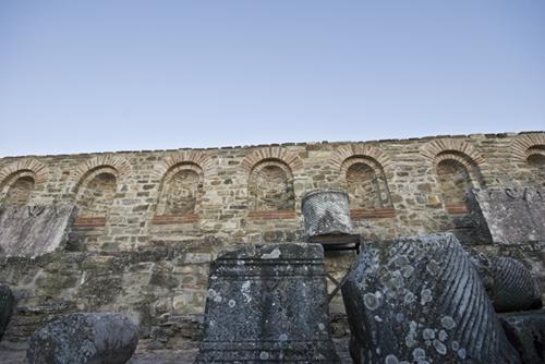 – Базенот бил ограден со плочи од црвеникав мермер, а во внатрешноста биле поставени мермерни постаменти. Постаментите и нишите биле украсени со скулптури. Во музејот во Белград се чуваат познатите бронзени сатири од Стоби, бронзени скулптури на Афродита, Аполон и Лар и мермерна глава на Серапис. Сите биле откриени во внатрешноста на базенот, каде се нашле по уривањето на палатата. Бронзените скулптури, како сатирите на пример, се од хеленистичко време – 2 век пред новата ера, додека палатата била изградена во 4 век – пишува во објаснувањето за објектот.