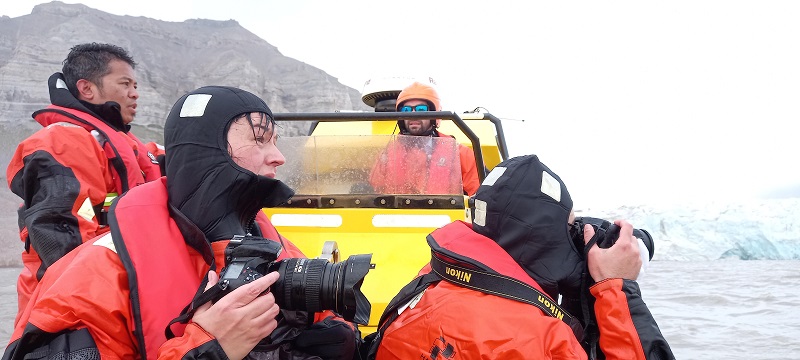 Едно искуство што ќе го паметам и во следните три животи е фотографирањето на бродот пред глечерите Тунабреен и Вон Постбреен кои се спојуваат во еден. За да се изведе оваа операција, моравме да се спуштиме од нашиот кузер во чамец за спасување среде Арктик. Моравме да се облечеме во посебни костими кои евентуално ќе не заштитеа од хипотермија. Само шестмина можевме да се качиме во чамецот и јас бев една од нив. Друг чамец за спасување беше подготвен во случај нешто да ни се случи. Науката вели дека најмногу три минути може да се преживее во такви екстремно ладни води. Бевме цели со вода, камерите ни беа мокри, ја пробавме водата од Арктикот ама успеавме да ги добиеме тие воодушевувачки фотографии. Исто така успеавме да земеме дел од мразот на Арктикот и да го донесеме на бродот.