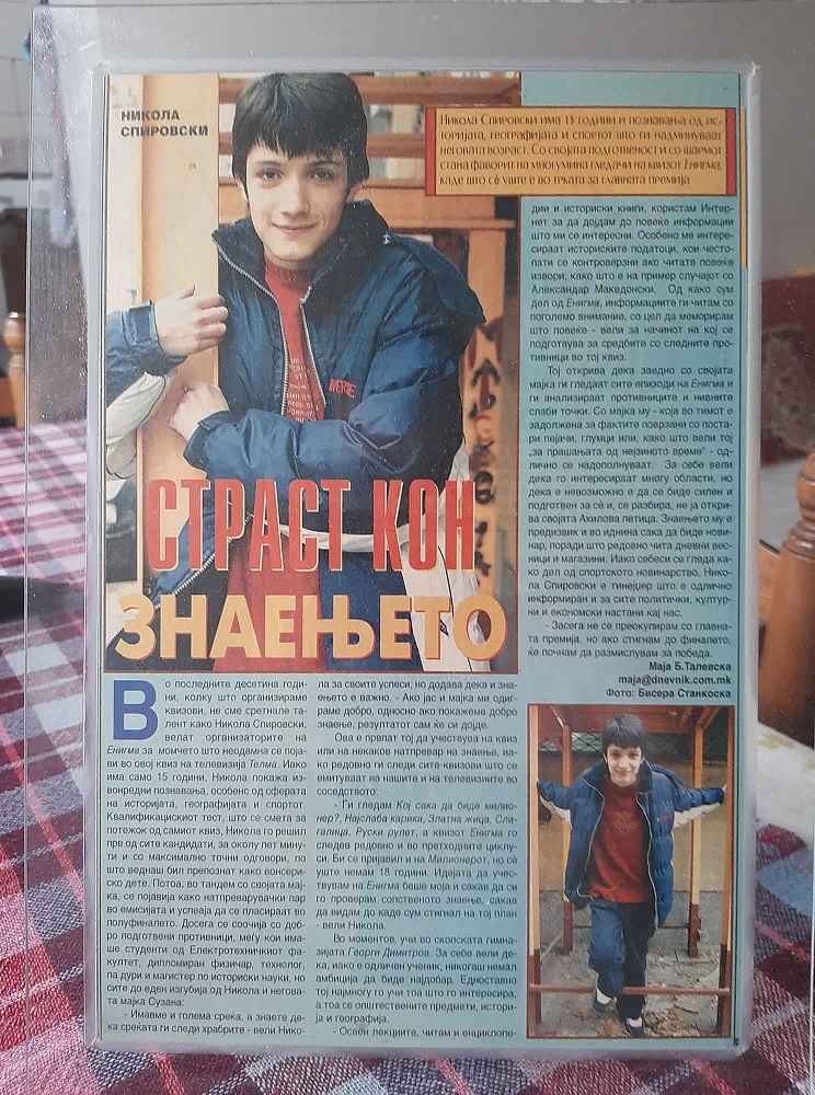 Никола Спировски од Скопје денес има 32 години и е магистер по меѓународно право и меѓународни односи. Пред петнаесетина години беше еден од најмладите учесници на квизови на знаење, кој дотурка далеку. Почнал со квизот „Енигма“ кога имал 15 години, а на 19 години учествувал на македонскиот „Кој сака да биде милионер“. Спировски вели дека мотивот да се пријави и да учествува на телевизиски квизови бил комбинација од знаењето што го покажувал дома додека гледал квизови, поттикот и поддршката од најблиските што му ја разгореле желбата за докажување против возрасни натпреварувачи, особено против оние со повеќегодишно искуство.