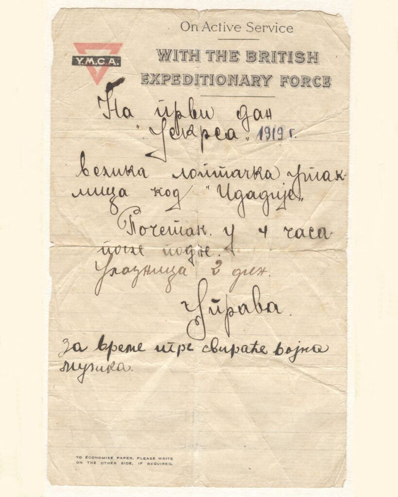 – Текстот на плакатот е напишан со ракопис на српски јазик. Големиот фудбалски натпревар бил закажан за првиот ден на Велигден, 1919 година, во 4 часот попладне кај тогашна „Идадија“. Управата ја информирала јавноста дека влезот за натпреварот ќе чини 2 динари, а за време на играта ќе свири воена музика. На плакатот може да се види името на британската воена мисија, испечатено на англиски јазик, како и симболот на „Христијанската машка младинска асоцијација“ (Y.M.C.A), која делувала како хуманитарна организација при британската мисија – објаснуваат од Музејот.