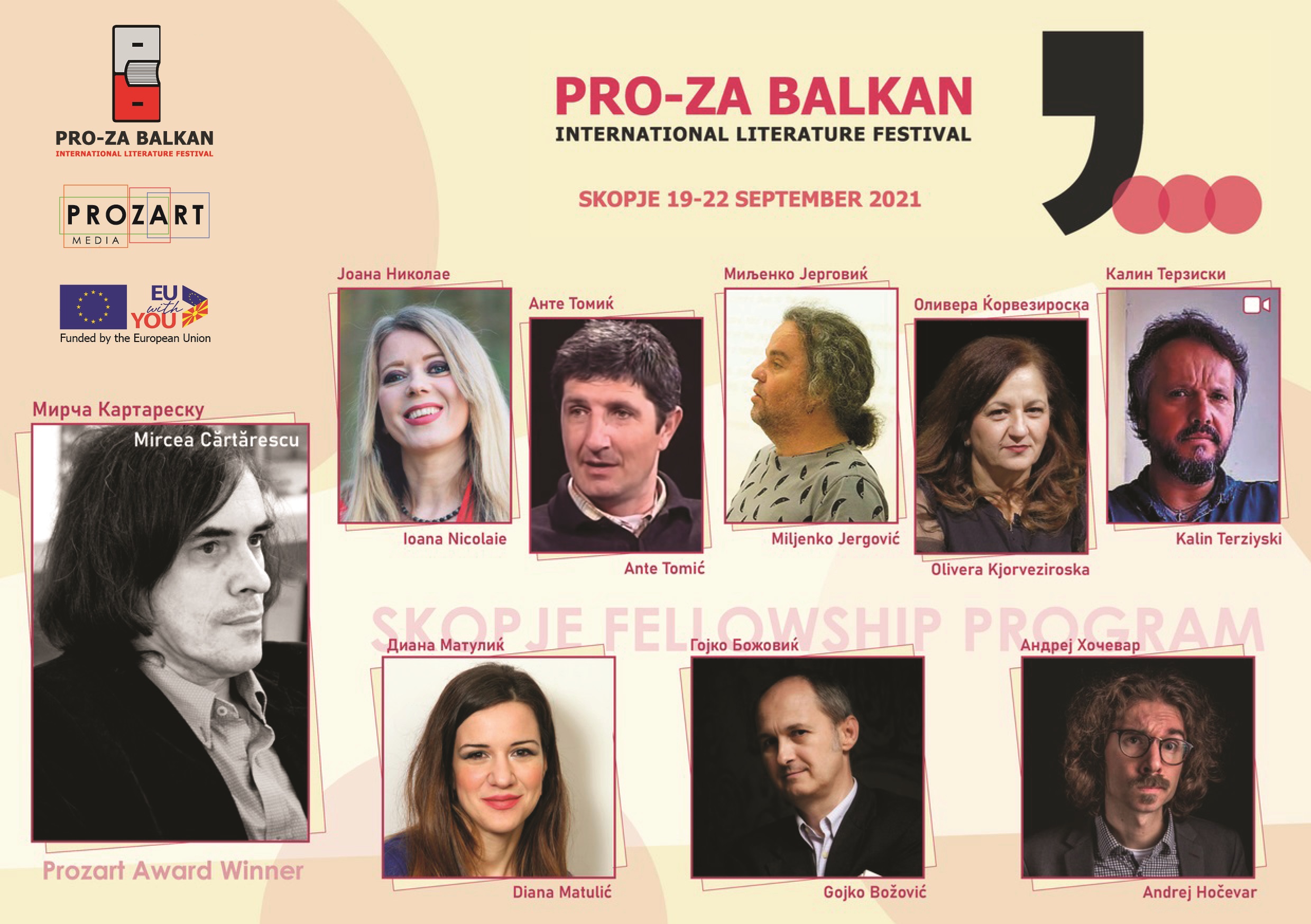 Деветмина писатели, издавачи, уредници од регионот и пошироко ќе бидат гости на 9. издание на Интернационалниот литературен фестивал „ПРО-ЗА Балкан“, што ќе се одржи од 19 до 21 септември во Скопје. На годинашниот лауреат Мирча Картареску, ќе му се придружат писателите и издавачи: Јоана Николае, Анте Томиќ, Миљенко Јерговиќ, Оливера Ќорвезироска, Гојко Божовиќ, Калин Терзиски, Диана Матулиќ и Андреј Хочевар. Нивното творештво ќе биде промовирано на отворањето на 19 септември, во Даут-пашиниот амам.