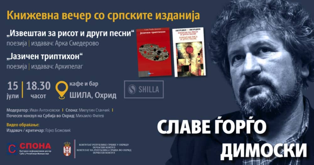 Kнижевна вечер со Славе Ѓорѓо Димоски посветена на неговата поезија објавена во препев на српски јазик ќе биде организирана вечерва во 18.30 часот во кафе-бар „Шила“ во Охрид. Настанот го организира Српскиот културно-информативен центар „Спона“.