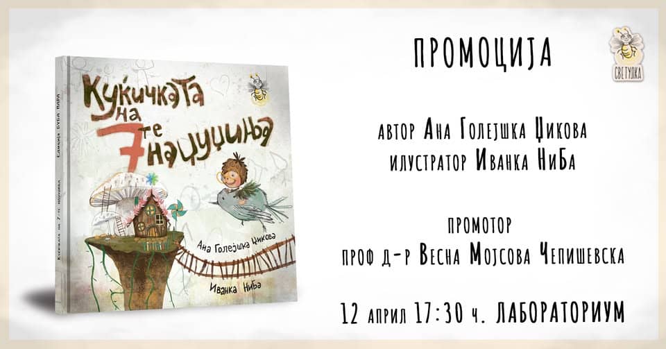 Во „Лабораториум“ во Скопје денеска во 17.30 часот ќе се одржи промоција на сликовницата „Куќичката на 7-те наџуџуња“ од Ана Голејшка-Џикова, авторка на текстот, со илустрации од Иванка Ниба. Ова е ново издание од едицијата „Светулка“ наречена „Буба Мара“ и е наменета за деца од предучилишна и раноучилишна возраст. Промотор на сликовницата е проф. д-р Весна Мојсова-Чепишевска.