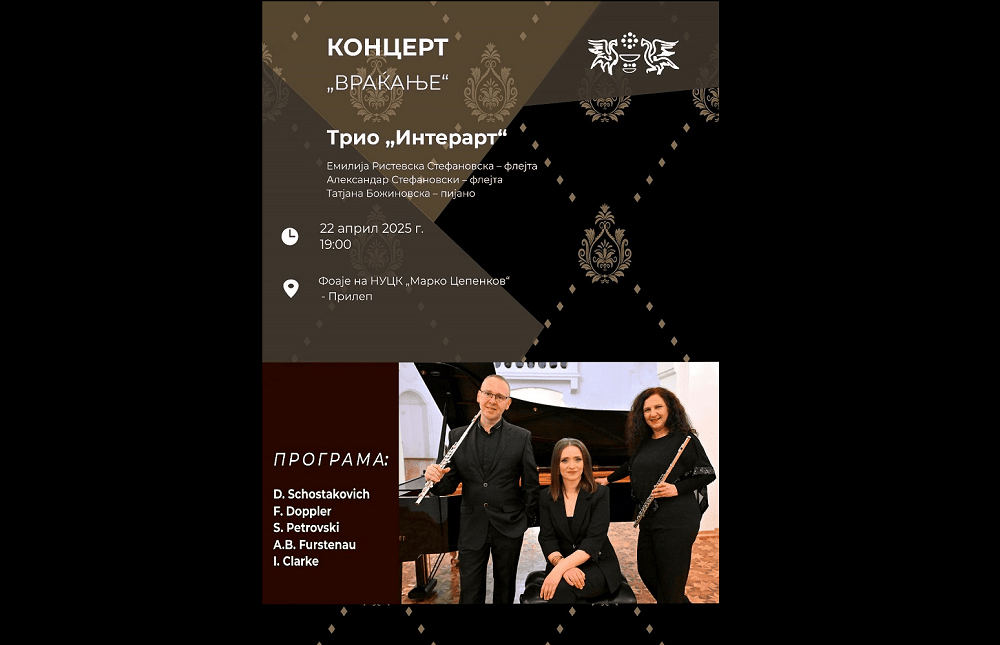 Во фоајето на Центарот за култура „Марко Цепенков“ во Прилеп утревечер во 19 часот „Трио Интерарт“ ќе го одржи концертот насловен „Враќање“. Ќе настапат флејтистите Емилија Ристевска- Стефановска и Александар Стефановски и Татјана Божиновска, на пијано. На програмата се дела од Шостакович, Доплер, Петровски, Фурстенау и од Кларк.