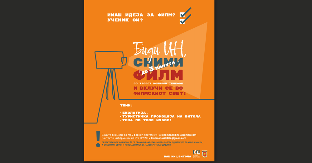 Културниот и информативен центар од Битола, со нова креативна иницијатива ги анимира младите битолчани од основните и средни училишта, преку создавање на кратки филмови да ја искажат својата креативна идеја. Пред идните сниматели, режисери и сценаристи или актери поставен е предизвик да снимат краток филм со времетраење до 3 минути, користејќи се со мобилен телефон, на темите: Туристичка промоција на Битола, Екологија и слободна тема.