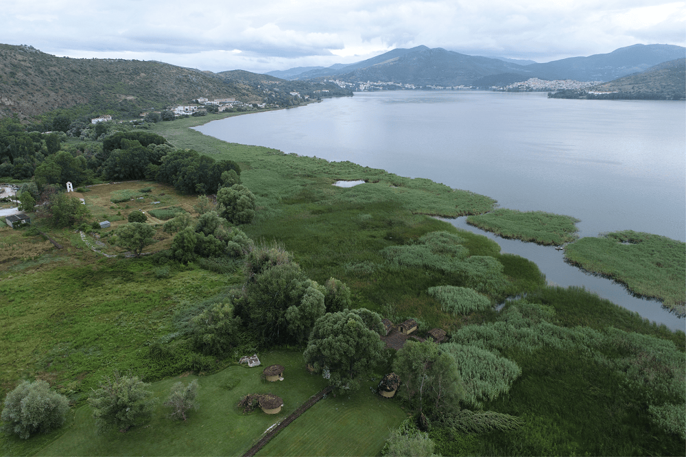 Поглед на локалитетот од дрон. Во долниот дел видлива е реконструкцијата/музејот, а погоре, десно од камбаната се археолошките сонди. Во далечината видливи делови од градот Костур околу Костурско Езеро. UniBern/Marco Hostettler