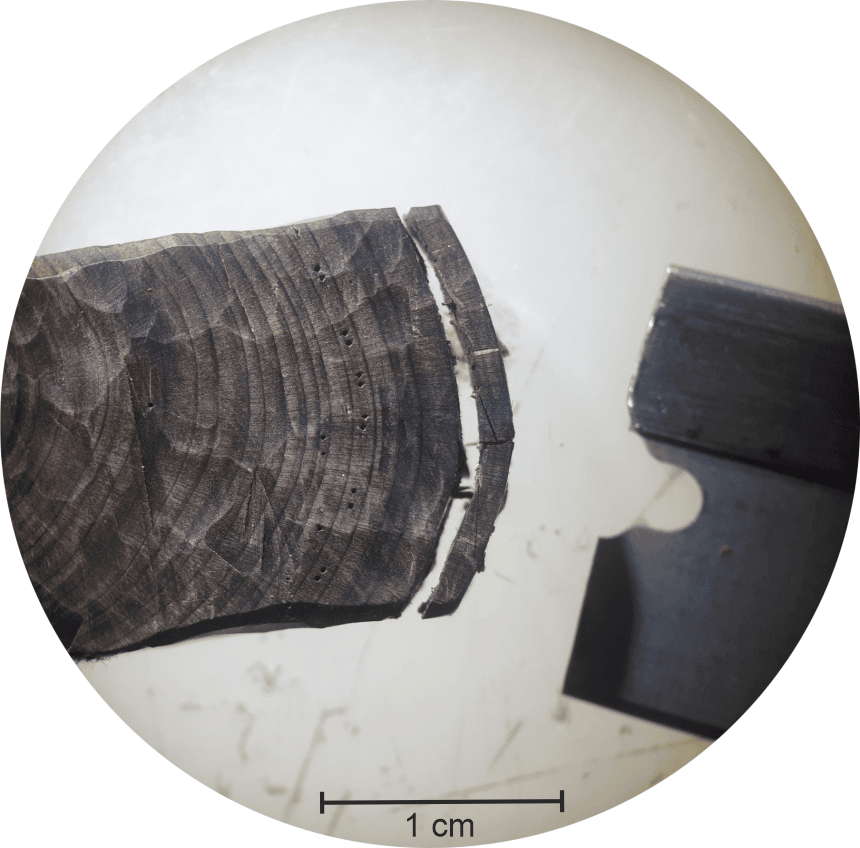Фотографија под микроскоп од процесот на одделување поединечни годови од примерок од дрво фоја за радиокарбон датирање. UniBern/Andrej Maczkowski