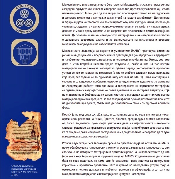 Софистицирана специјализирана техничка опрема за зачувување и дигитализирање на културни артефакти и споменици на културно наследство денеска во 11 часот ќе биде донирана на Македонската академија на науките и уметностите. Опремата ја донира Ротари клубот „Скопје вест“ кој обезбеди свои средства и од донациите собрани на клупската донаторска вечер одржана во мај оваа година во Даут-пашиниот амам. На настанот ќе биде потпишан и договор за изработка на модерна веб страница на МАНУ.