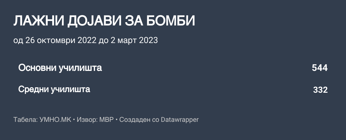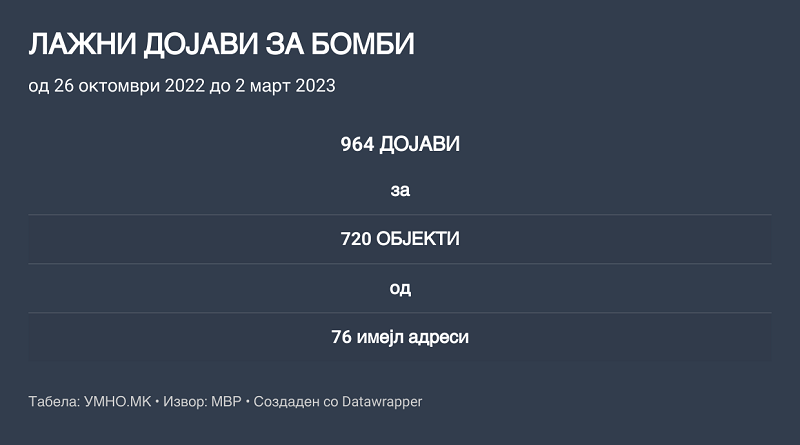 Серијата од повеќе од 950 лажни дојави за поставени бомби, далеку најчесто во училишта, која траеше 128 денови минатата учебна година заврши со одлука на властите да ги променат протоколите за постапување, чекор кој недоволно го објаснија, и да престанат да ја известуваат јавноста за такви дојави. Властите тврдат дека „од тој момент, веќе нема дојави на имејловите на училиштата“, но никогаш не објаснија како и зошто. Иако најавуваа дека се во трага на група која ги праќа заканите, македонските институции до денес не дадоа нова информација за евентуалните заканувачи.