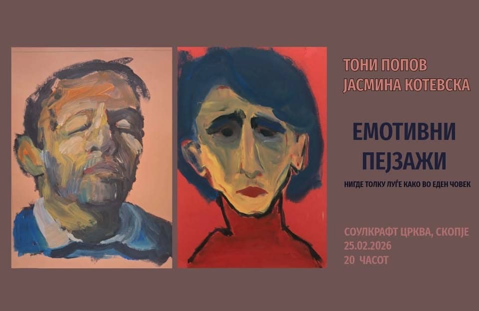 Во Младинското друштво „Соуллрафт“ во Скопје (Бул. „Илинден“ бр. 9) вечерва во 20 часот ќе биде отворена изложбата „Емотивни пејзажи“ на сликарот Тони Попов и историчарката на уметност Јасмина Котевска. Изложбата поставува прашања: Колку сме подготвени да се соочиме со туѓата, но и со сопствената емоционална голотија? Дали во туѓиот портрет препознаваме дел од себе и дали уметноста може да биде безбедно место за ранливост исто како и пријателствата?