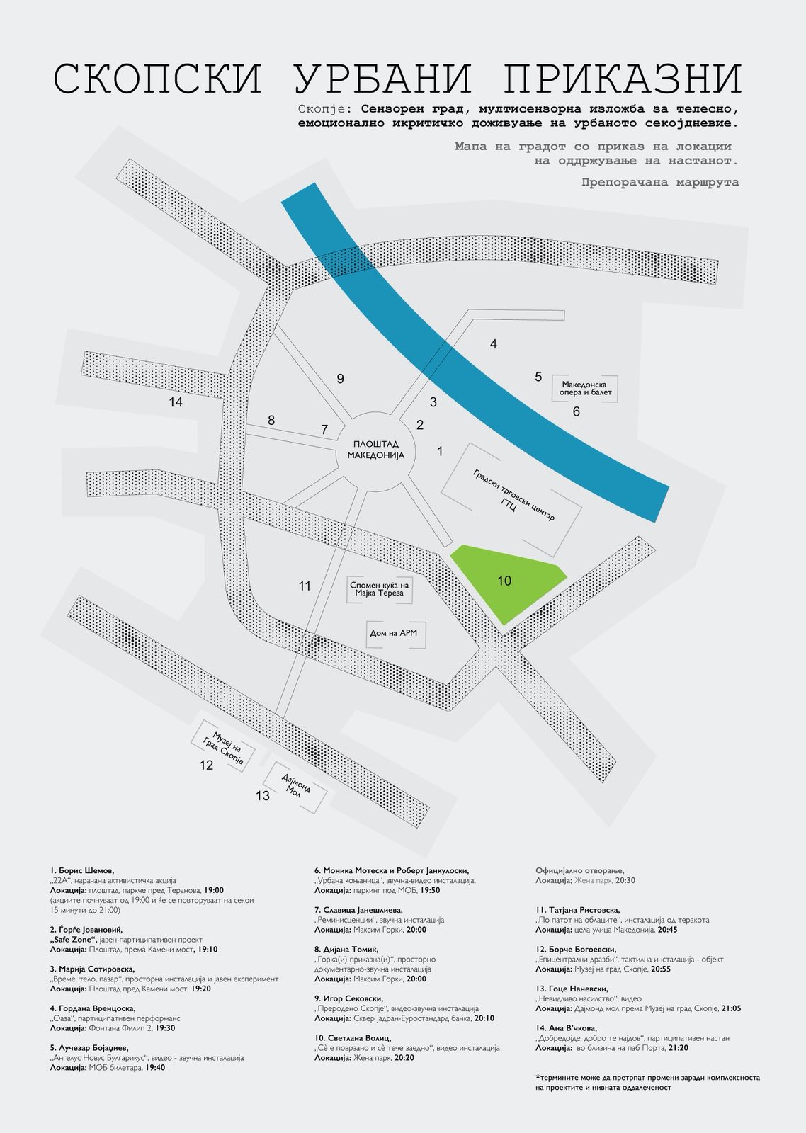 На повеќе локации во Скопје, вечерва од 19 часот ќе се одржи мултисензорна изложба „Скопски урбани приказни“ на Уметничкиот совет на Друштвото на ликовни уметници на Македонија. Куратор на изложбата е Ана Франговска и Уметничкиот совет на ДЛУМ. Изложбата ќе се реализира на неколку локации на Плоштадот, кај Камени мост, на ул. Максим Горки, кај билетарницата на Македонската опера и балет. За повеќе детали, погледнете ја мапата.