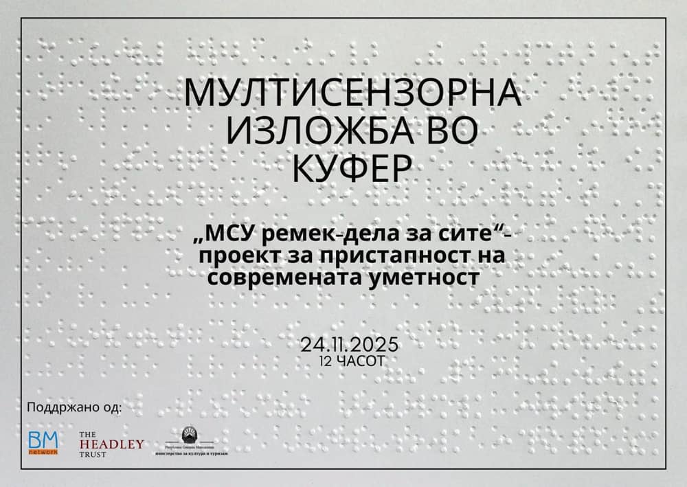 Музејот на современастса уметност вo Скопје, утре на пладне промотивно ќе ја прикаже мултисензорната изложба „Музеј во куфер“ составена од тактилни слики од 11 внимателно селектирани дела од колекцијата на МСУ, во рамките на проектот „МСУ Ремек-дела за сите – проект за пристапност на современата уметност“ (“MoCA Masterpieces 4 all” – Project for accessibility of Contemporary Art). На оваа изложба од 11 панели, освен фотографии и објаснувања за делата од колекцијата, направени се и НФЦ тагови и QR кодови, пропратени со аудиоописи, видеа на знаковен јазик и описни текстови на Брајово писмо. Во рамките на проектот на проектот ќе се изготват и три уметнички 3Д дела инспирирани од колекцијата на МСУ.