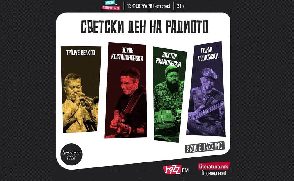 Во книжарницата на Литература.мк во трговскиот центар „Дајмонд мол“ во Скопје вечерва во 21 часот ќе се одржи музичка вечер посветена на Светскиот ден на радиото. Ќе настапат Трајче Велков, Зоран Костадиновски, Виктор Филиповски и Горан Гешовски.