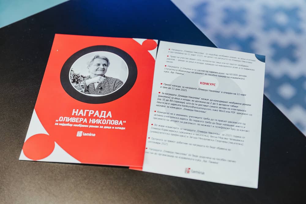 Издавачката куќа „Арс Ламина“ од денеска ја востанови наградата „Оливера Николова“ за најдобар необјавен роман за деца и млади. Наградатa се воведува токму на 11 март, денот на раѓањето на најважната писателка за деца во нашата книжевност, Оливера Николова. На прес-конференцијата што денеска се одржа во „Литература.мк“, во „Дајмонд мол“ се обратија Бранка Бугариска (директорка на издаваштво во „Арс Ламина“) и членовите на жирито за наградата „Оливера Николова“ за 2025 година: Оливера Ќорвезироска (уредничка и писателка), Весна Мојсова-Чепишевска (универзитетска професорка) и Јагода Михајловска-Георгиева (писателка).