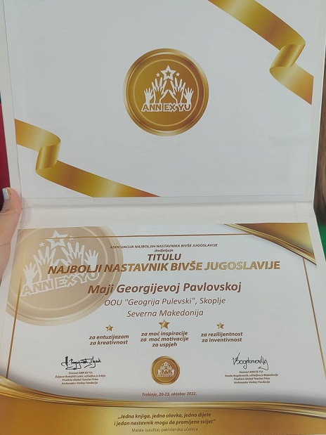 – Тимот наставници кој ја претставуваше нашата држава на Петтата Меѓународна конферниција на ANN EX YU, под мотото „Обрaзованието ги брише границите“ броеше 17 наставници од нашата земја од кои пет го понесоа призанието најдобар наставник. Носители на признанието – најдобар наставник на Асоцијацијата на најдобрите наставници од поранешните југословенски просто, освен мене, се: Климентина Петрушевска, градинка „Весели Цветови“, Скопје, Василка Ѓурчиновски, ОУД „Лазар Лазаревски“ – Велес, Станче Штејровска од ООУ „Крсте Мисирков“, Куманово, Хилда Димитриевска, ООУ „Крсте Мисирков“, Куманово. Носител на признанието најдобар директор е Кети Стевананџија, ООУ „Кире Гавриловски Јане“, Прилеп. Ксенија Маказлева Трајчева, амбасадор на ANN_EX_YU, на ова конференција доби признание „Амбасадор за 5“, како најдобар амбасадор кој доаѓа надвор од воспитно-образовниот процес за континуирана поддршка на конференцијата. Исто така, Јелена Мандиќ доби призанание за „Амбасадор за 5“, како наставник кој редовно ги следи и промовира сите 5 конференции.