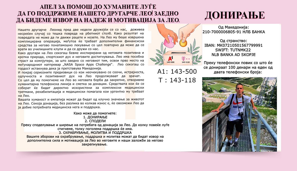 Леонид Индов во тешка несреќа летово доби повреди на ‘рбетот и по комплексната операција, неговиот живот сè уште е во опасност. Како последица на повредата не може да ги движи рацете и нозете. Потребни се дополнителни финансиски средства за неговото тековно лекување за да ја врати способноста да се врати на училиште.