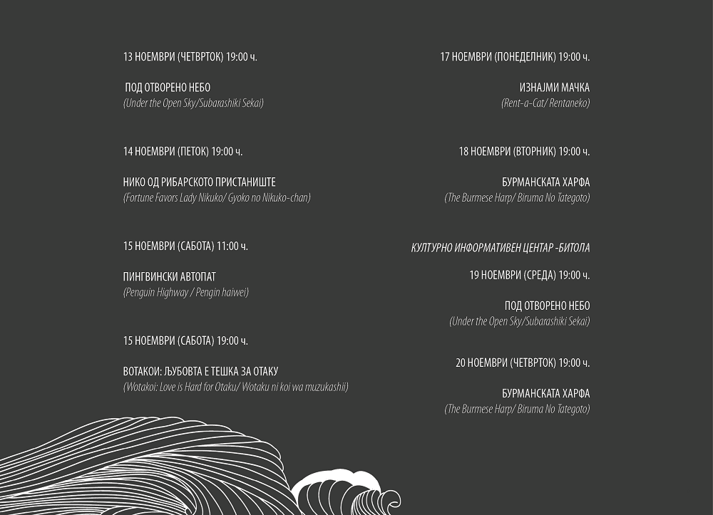 – Циклусот на јапонски филмови е еден од најзначајните филмски настани во годината, кој носи ретка можност за македонската публика да се запознае со длабочината, комплексноста и уникатната естетика на јапонската кинематографија. Овој циклус нуди не само визуелно задоволство, туку и увид во културните, историските и социјалните промени што го обликуваат јапонското општество – велат од Кинотеката.