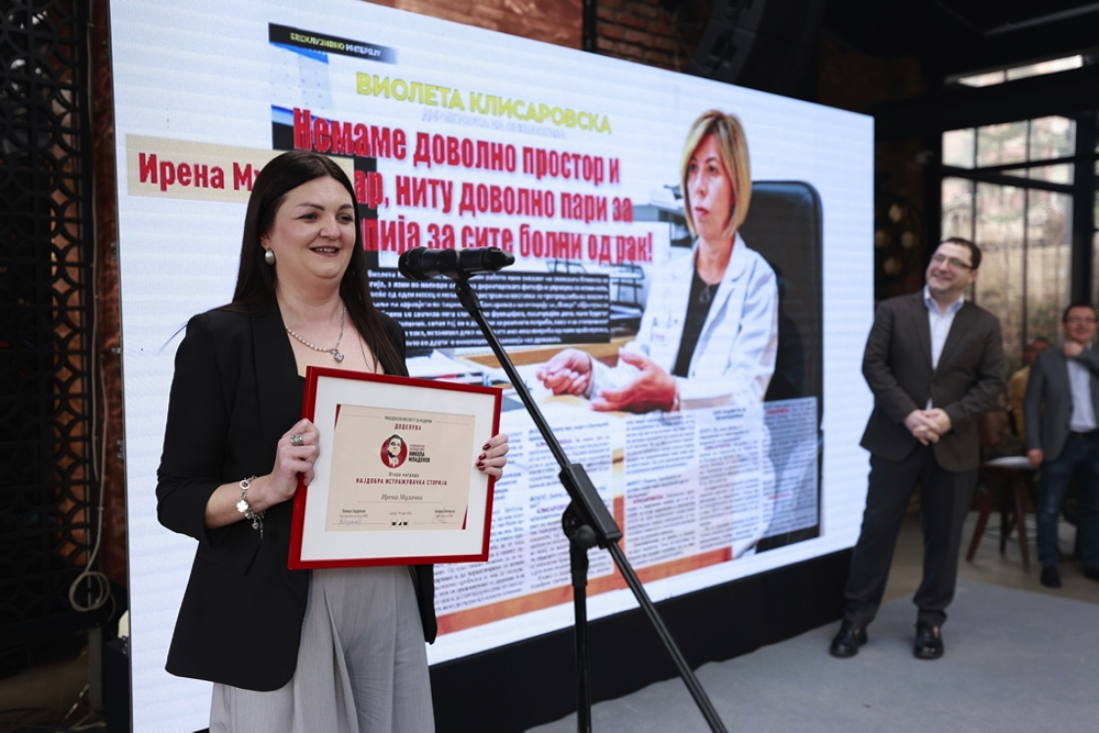 Втората награда за Најдобра истражувачка сторија ја доби новинарката Ирена Мулачка за серијалот текстови поврзани со случувањата на Клиниката за онкологија, објавени во неделникот „Фокус“.