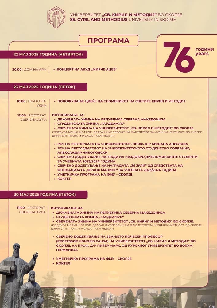 Со концерт на Академското културно-уметничко друштво „Мирче Ацев“ во Дом на АРМ во Скопје вечерва во 20 часот Универзитетот „Св. Кирил и Методиј“ во Скопје ќе го почне одбележувањето на 76 години од своето основање. Централниот настан ќе се одржи утре во 10 часот на платото пред Ректоратот со положување цвеќе на споменикот на светите Кирил и Методиј. Напладне во свечената аулата обраќања ќе имаат ректорката, проф. д-р Биљана Ангелова и претседателот на Универзитетското студентско собрание, Александар Николовски. Потоа ќе бидат доделени наградите за најдобрите дипломирани студенти за учебната 2023/2024 година и наградата „26 Јули“ од Фондацијата „Франк Манинг“. Настанот ќе биде збогатен со уметничка програма на студентите од Факултетот за музичка уметност.