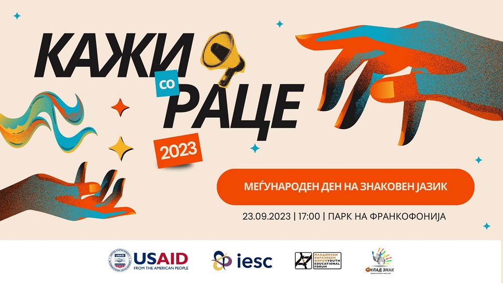„Кажи со раце“ е насловен младинскиот настан со кој денеска во 17 часот во Паркот на франкофонијата во Скопје ќе биде одбележан Меѓународниот ден на знаковниот јазик. Присутните ќе учат како да ја совладаат азбуката на знаковен јазик, да се претстават и да споделат интересни факти за себе и ќе се вклучатво младинска уметничка акција.