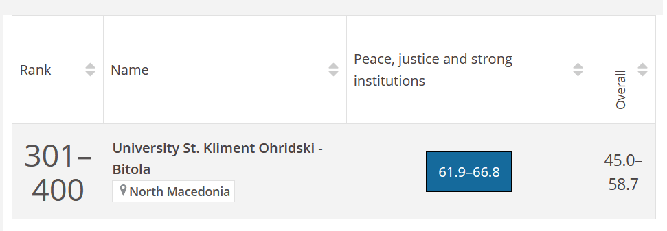 – Категоријата University Impact Rankings опфаќа универзитети кои се истакнуваат во остварување на Целите за одржлив развој на Организацијата на обединетите нации („Sustainable Development Goals“ / “SDGs“) https://www.timeshighereducation.com/world-university-rankings/university-st-kliment-ohridski-bitola). Универзитетот „Св. Климент Охридски“ – Битола во вкупното рангирање е рангиран на позиција од 1000 до 1500. Во целокупното рангирање се вклучени 2.152 универзитети од 125 земји. Но, посебно радува фактот што во еден од четирите главни категории или столбови на евалуација, категоријата „Мир, правда и силни институции“, УКЛО е вреднуван во првите 400 универзитети во светот (од 301 до 400) – велат од УКЛО.