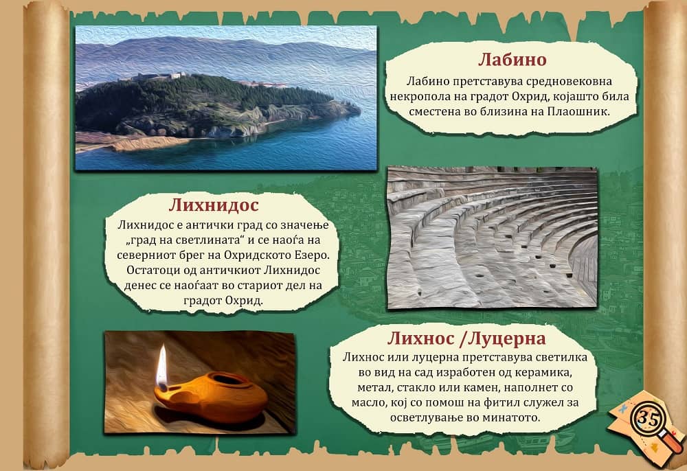 Плаошник, Лабино, Лихнидос, луцерна, погребна маска, поликонхална базилика … Ова се само неколку од термините објаснети во новото издание на литература за деца „Охридска археолошка азбука“ чија цел е да ги едуцира најмладите за културното наследство на Охридскиот Регион. Книгата ја подготвија универзитетски професори од различни области (од Филозофскиот факултет во Скопје), под покровителство на охридскиот градоначалник Кирил Пецаков.
