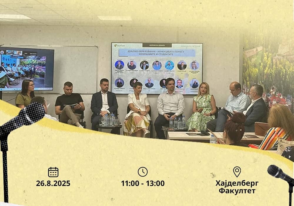 „Дуално образование – конекцијата помеѓу компаниите и студентите“ е насловот на дебатата што ќе се одржи утре од 11 до 13 часот на факултетот „Хајделберг“ во Скопје. Присутните ќе ги поздрават проф. д-р Урлих Цајтел, претседател на бордот на директори и проф. д-р Синиша Наумоски, генерален менаџер на факултетот.