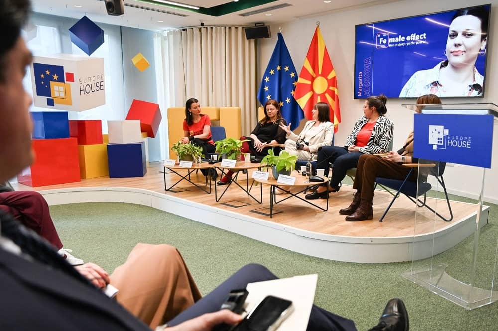 На панел-дискусијата во Јуроп хаус Скопје под мотото (Fe)male Effect: Her Story, Her Path, Her Power инспиративни беа панелистките Кристина Василатоу, заменик-шеф на мисија во Амбасадата на Грција во Скопје, професорката Маја Бојаџиевска од катедрата за Општа и компаративна книжевност при Филолошкиот факултет во Скопје, Драгана Стикова од платформата „Наука за деца“ и Маргарита Арсова од Младинскиот културен центар. Низ разговорот ги модерираше новинарката Ана Зафирова