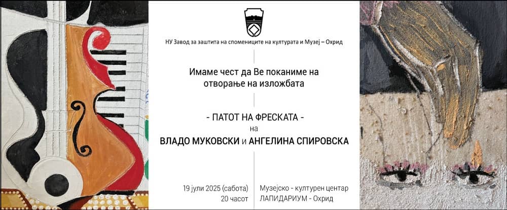 Во Музејско – културниот центар „Лапидариум“ во Охрид утревечер во 20 часот ќе биде отворена изложбата „Патот на фреската“ од Ангелина Спировска и Владо Мукоски. Авторите ќе се претстават со 17 дела изработени во текот на оваа година. Изложбата на современи фреско слики претставува современ визуелен дијалог со традицијата. Делата се изведени во автентичната фреско техника, но носат мотиви и пораки кои говорат на јазикот на денешнината.