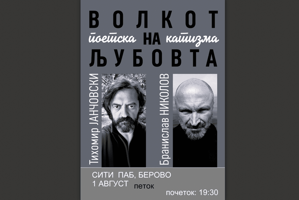 Поетско-музички перформанс со Бранислав Николов и Тихомир Јанчовски ќе се одржи вечерва во 20 часот во Сити паб во Берово. Публиката ќе може да слушне антологиски стихови од современата македонска поезија (Б. Конески, Г. Тодоровски, П. М. Андреевски, Р. Павловски) и ќе бидат испеани најубавите љубовни песни од македонските фестивали.